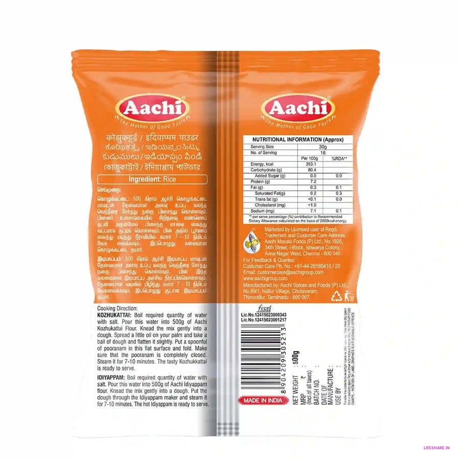 Aachi Kozhukattai & Idiyappam Maavu ensures safe, worry-free cooking at home. By controlling the quality of ingredients and the cooking process, you can make healthier, preservative-free versions of traditional dishes. The flour is ready to cook, requiring minimal effort while guaranteeing a consistent texture and perfect results. Whether you're steaming Kozhukattai or Idiyappam, Aachi Maavu offers a natural, home-cooked alternative to store-bought snacks, giving you peace of mind about what goes into your meals. Additionally, you can control the amount of oil and seasonings used, making it a great option for those looking to enjoy traditional foods in a healthier way.