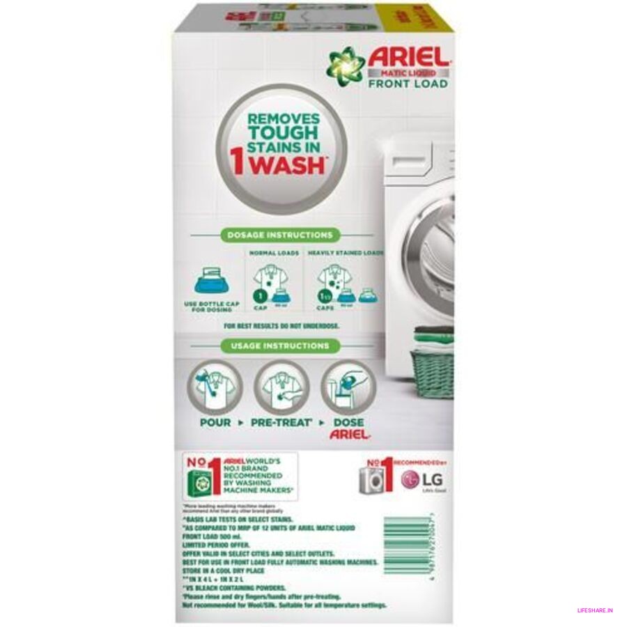 Ariel Matic Liquid is specially designed for front-load washing machines, delivering tough stain removal in just one wash while being gentle on fabrics. Its liquid formula dissolves easily in water, leaving no residue on clothes or in the machine. With a refreshing fragrance, it not only cleans but also keeps clothes smelling fresh all day.