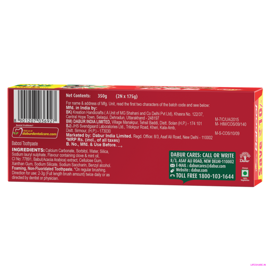 1. Safeguards teeth and gums with the natural power of babul and clove. 2. Babool's astringent action tightens the gums, protecting against gum swelling and all manner of gum diseases. 3. Clove oil helps fight off germs that cause cavities. 4. Refreshes you with a minty taste.