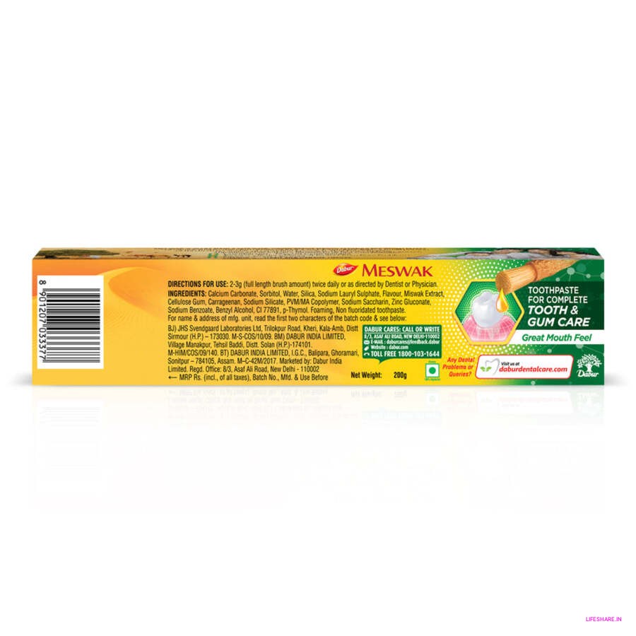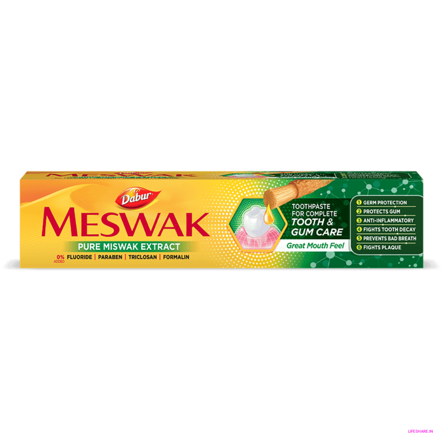Complete Oral Care - Fights tartar & plaque, protection from cavities, fights tooth decay, fights germs & bacteria, gingival protection & removes malodour. Potent Miswak Extract - Scientifically proven to give Ayurvedic A3 protection. Antibacterial - Protects your teeth from harmful germs and bacteria. Anti-inflammatory & Astringent - Prevents inflammation of gums & oral cavity. Tightens gum-grip.