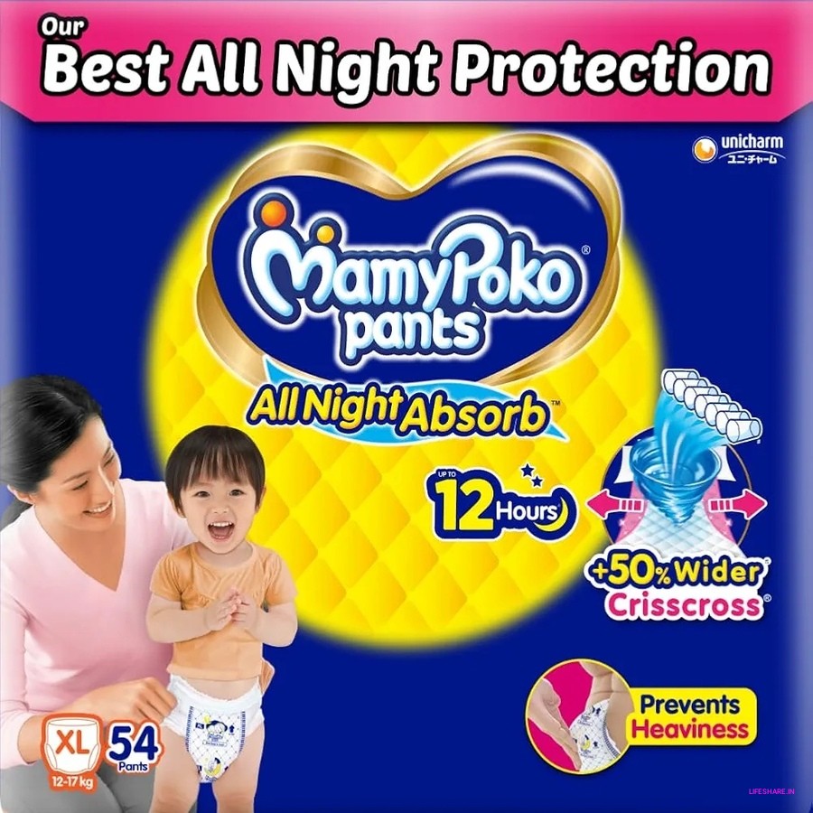 India's 1st Pant style diaper & Mother's first choice. Introducting New and Improved Mamypoko pants All night absorb diaper specially designed to provide upto 12hr protection from leakage and heaviness, so your baby enjoys uninterupted sleep all night.