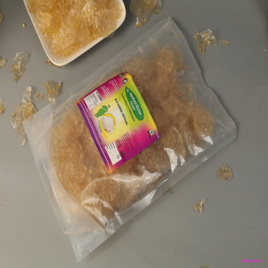 Introducing our Javvarisi Vathal, a traditional South Indian sun-dried snack made from sago pearls. These crispy vathals are perfect for snacking or as a side dish with your favorite meal. Simply fry them in hot oil until they puff up and turn golden brown for a delicious and crunchy treat. Our Javvar