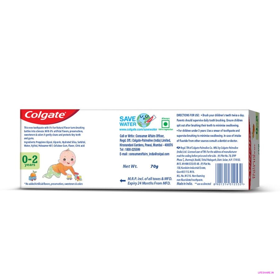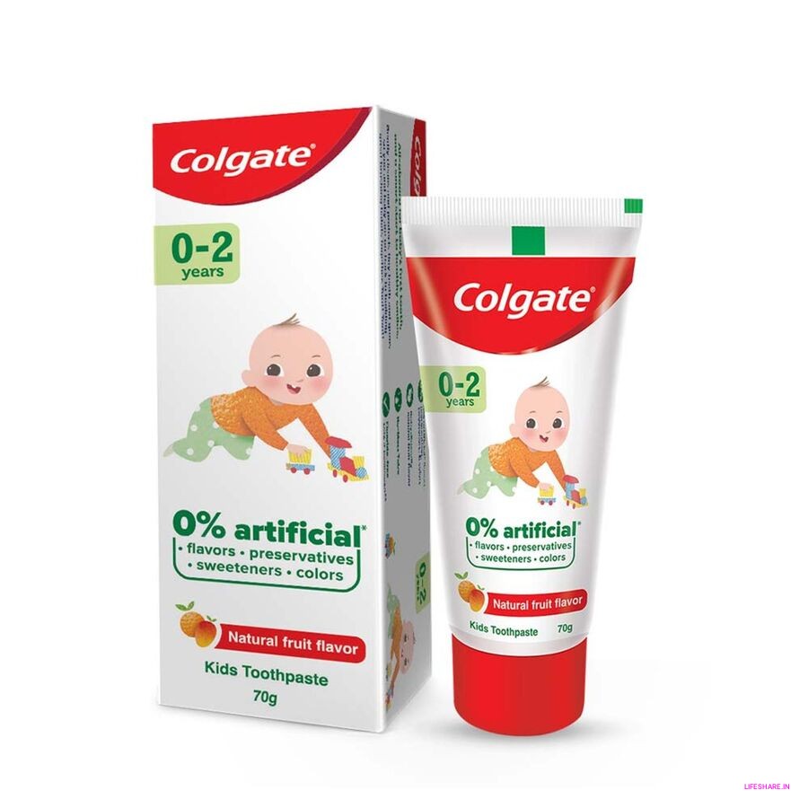 Colgate Kids 0-2 years baby toothpaste is made with 0% artificial preservatives, colors or sweeteners.