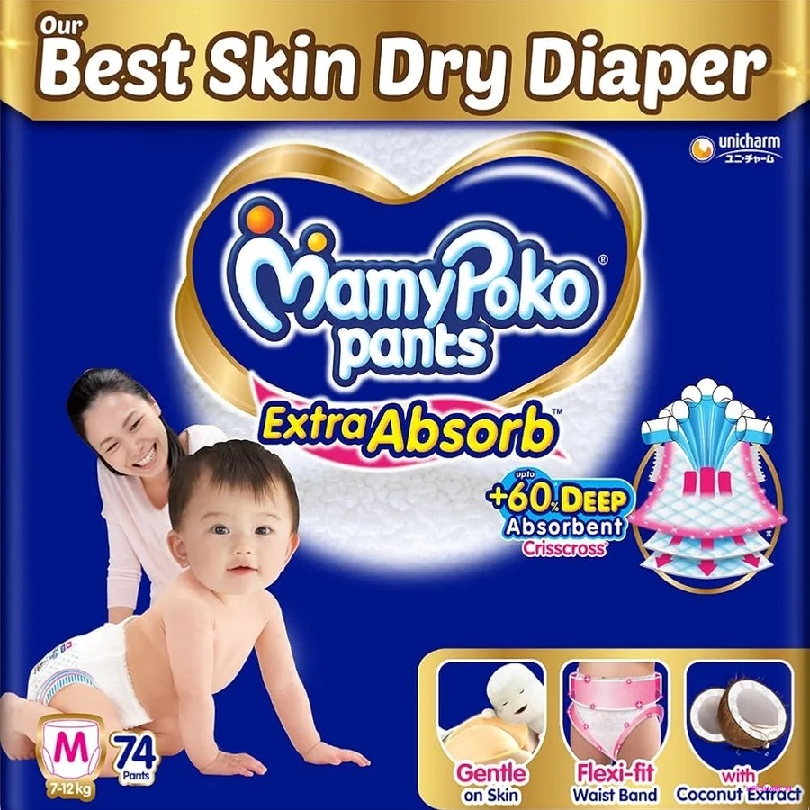 MamyPoko Pants Extra Absorb Baby Diapers, Medium (M size) | 7-12 kg | 74 Count