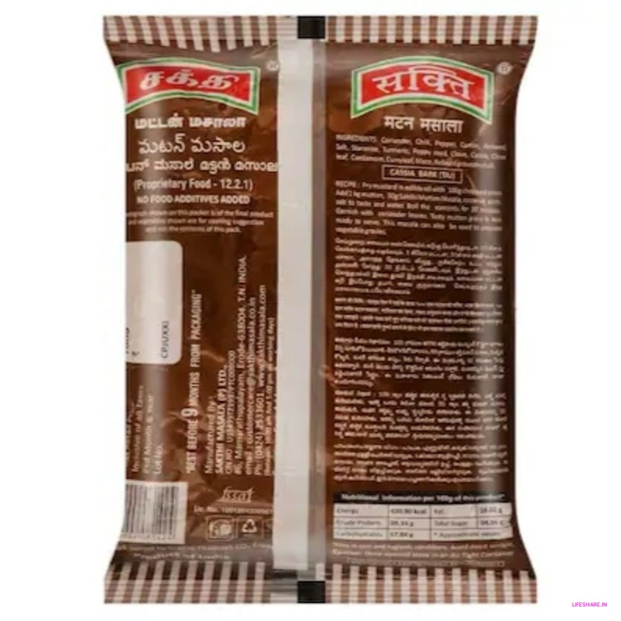 Sakthi Mutton Masala is a flavorful blend of carefully selected spices, specially crafted to bring out the authentic taste of traditional mutton dishes. This aromatic mix adds rich color, irresistible aroma, and mouthwatering taste to your curries, gravies, and fry recipes. With the perfect balance of spices, Sakthi Mutton Masala makes cooking easy while ensuring your mutton dishes are always delicious and full of flavor.