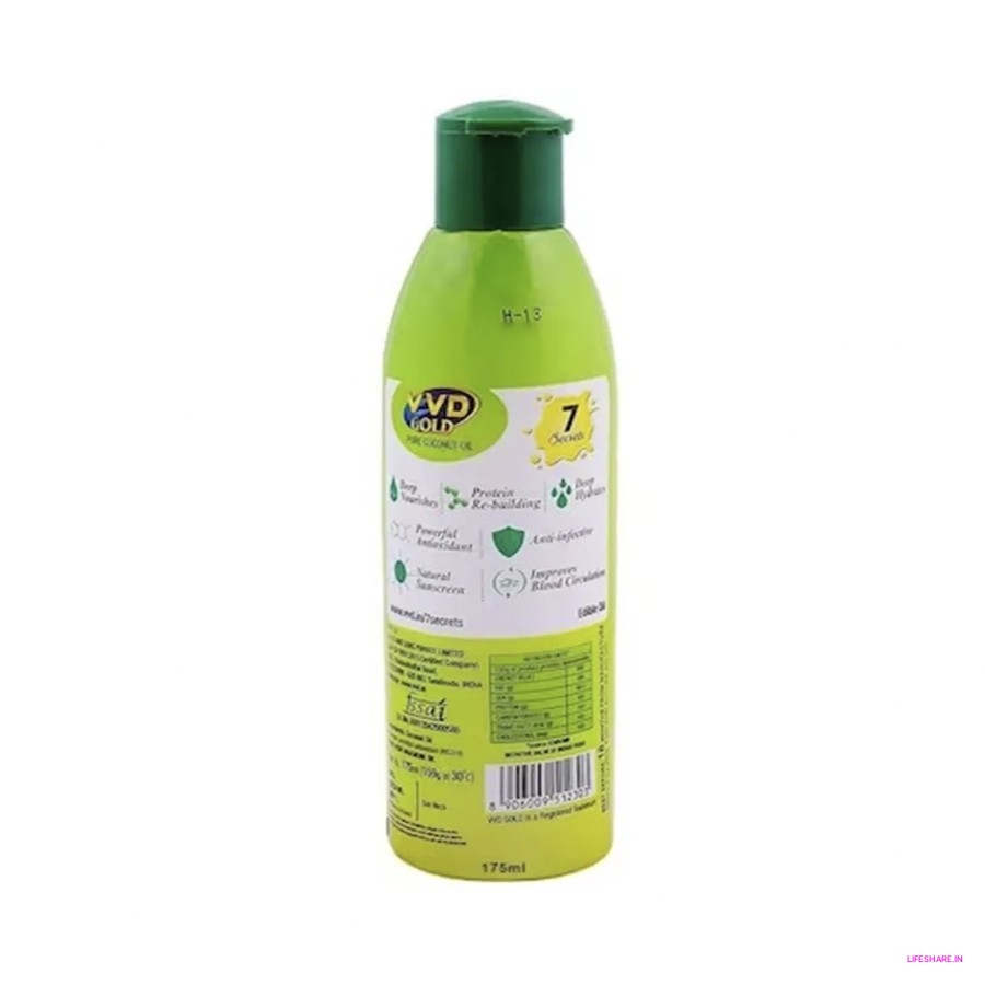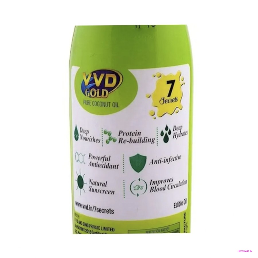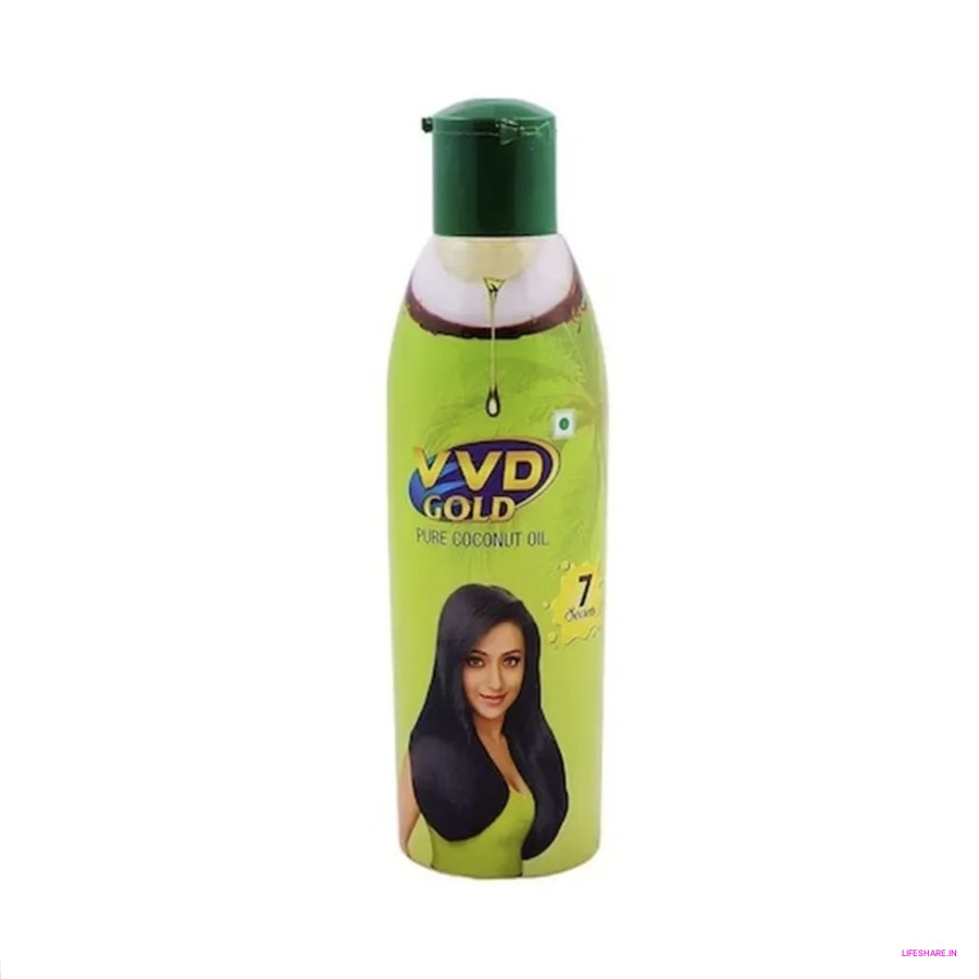 VVD Gold Pure Coconut Oil is a skincare product made from coconuts. It's a simple and natural oil that can be used for various purposes. This oil can moisturize your skin, making it softer and smoother. You can also apply it to your hair to add shine and manage frizz.
